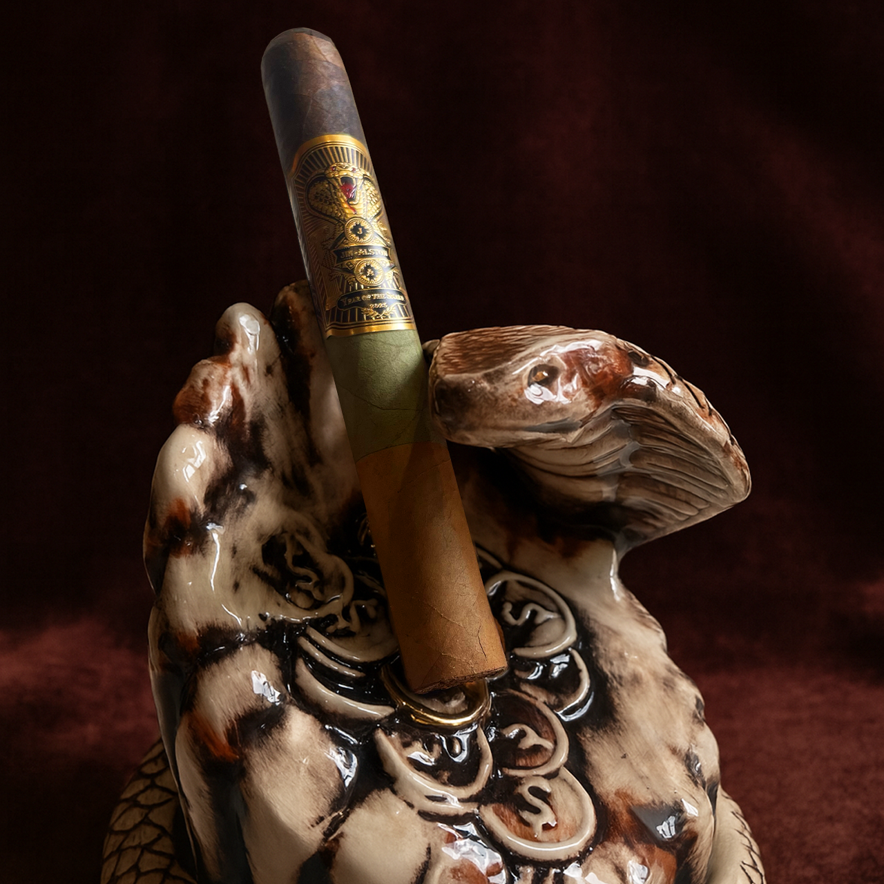 The JIN•ALSTON Year of the Snake cigar is encased in a meticulously carved clay vessel — a symbol of eternal guardianship. Wrapped with a blend of three distinct tobaccos, each draw unveils a journey through a mythical jungle: